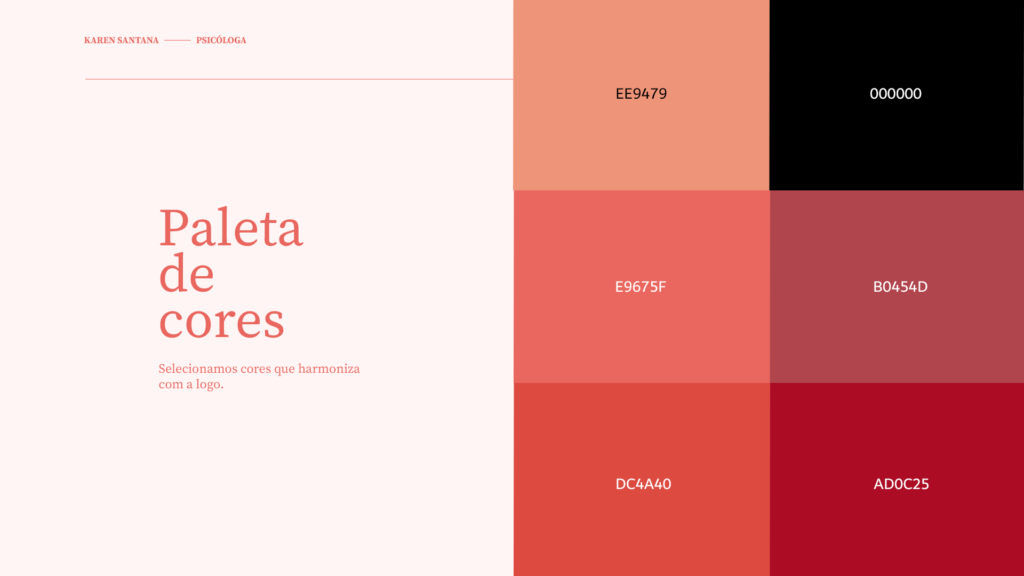 A paleta de cores foi criada pensando na logo e pensando em tranquilidade, paz e sofisticação. Utilizamos uns tons que atraia mais calma, descontração, o que uma psicóloga pode trazer.