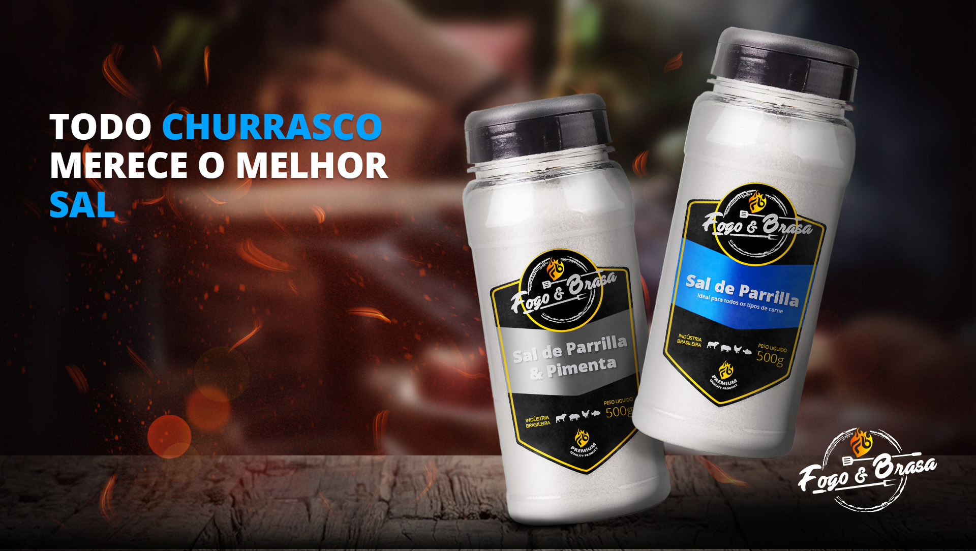 A Fogo e Brasa é uma empresa especializada em produtos para churrasco, conhecida pela diversidade de produtos, tradição e confiabilidade. Sabemos que é um mercado muito concorrido e a ideia é criar sempre produtos com embalagens modernas, minimalista e que transmitam toda a força da marca para consolidar sua posição no mercado. Para a criação do rótulo, estabelecemos que sua comunicação deveria ser simples e direta. A fonte principal é de um estilo não serifada, forte e fácil legibilidade, assim como todos os elementos do rótulo. Pensamos apresentar o produto de uma forma “sincera”, pois os clientes esperam que o sal para churrasco seja de qualidade e que a marca traga a familiaridade e confiança da Fogo e Brasa.